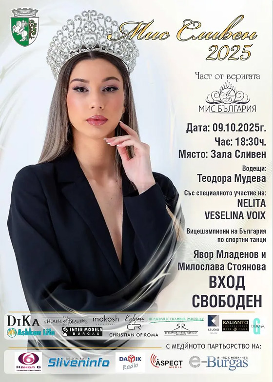 "Мис Сливен 2025" ще се проведе на 9 октомври (четвъртък) в зала "Сливен", от 18:30 часа, като част от веригата "Мис България" – най-престижният конкурс за красота в страната.